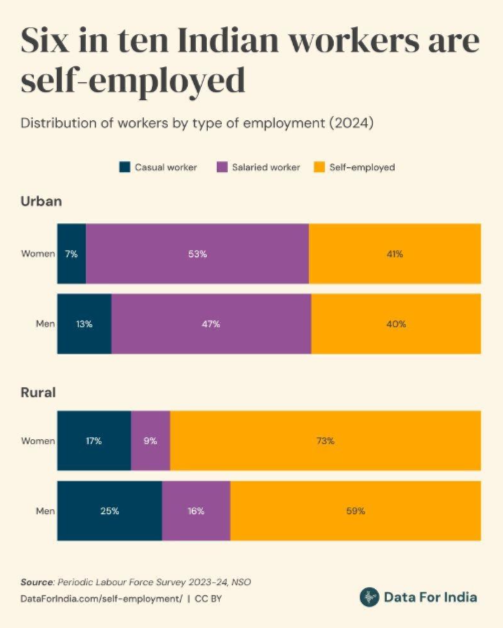 Did you know that over half of India’s workforce is self-employed? According to labour data, more than 55% of the Indian workforce works on their own account or runs small independent enterprises, while around 22 % are casual workers and only about 21.5 % are formal salaried employees.